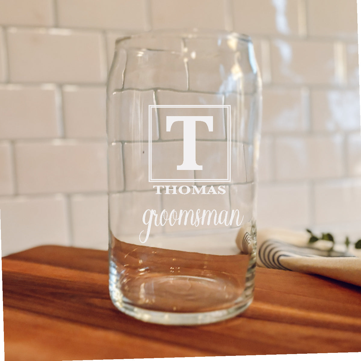 Personalized Beer Can Glasses, available as a single, set of 2 or 4. These glasses make a great gift for a beer lover, groomsmen/best men, housewarming or any occasion gift. Crafted with care and with laser engraving precision, each 16 oz glass boasts a durable build and is permanently adorned with a modern design.