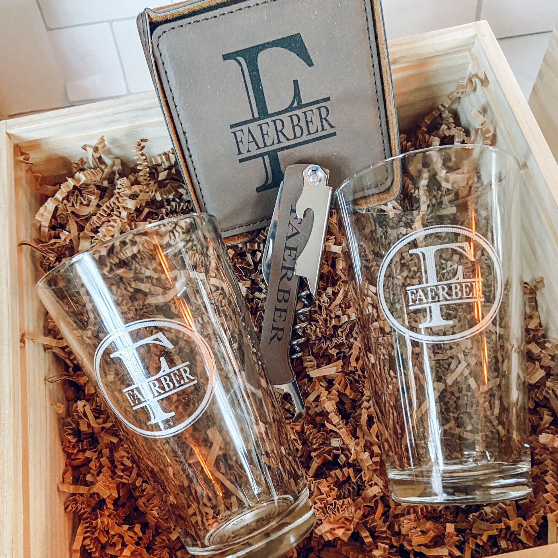 Brew Master's Custom Gift Box: Engraved Glasses, Coasters & Bottle Opener