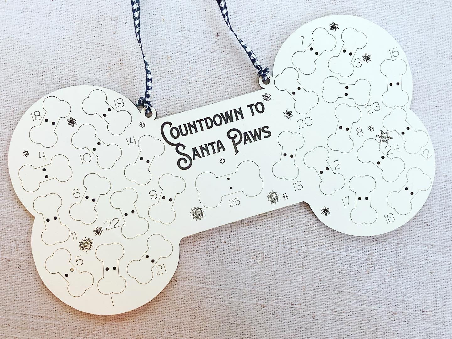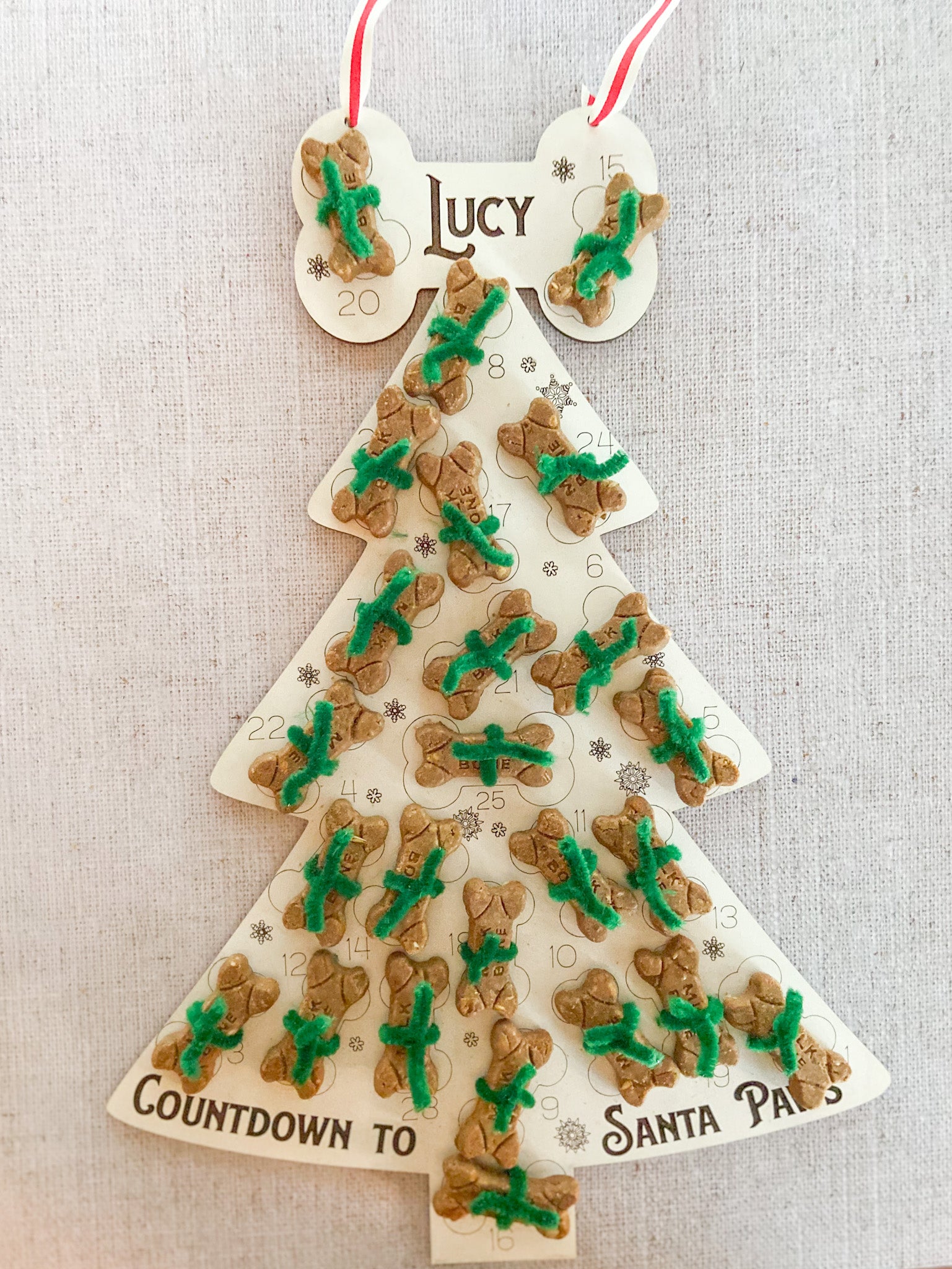 Advent calendars are not just for the kids! Your favorite fury friend deserves a treat too. Pipe cleaners for attaching treat are included, bones/treat are not. Available in tree or bone with or without personalization.