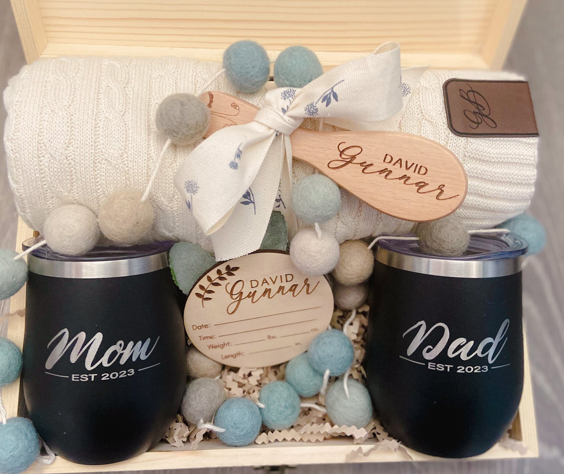 Celebrate a new arrival and the new parents. This beautifully set comes packed in a personalized wood memory box. Gift includes a cozy personalized baby blanket for snuggle times; a charming baby birth announcement sign for commemorating the special arrival; and a gentle baby brush, customized with the baby's name and birth month flower for a personal touch. To toast to the new chapter, we've also included stylish wine tumblers for mom and dad. Every item is thoughtfully chosen making it not just a gift, but items that will become special keepsakes.