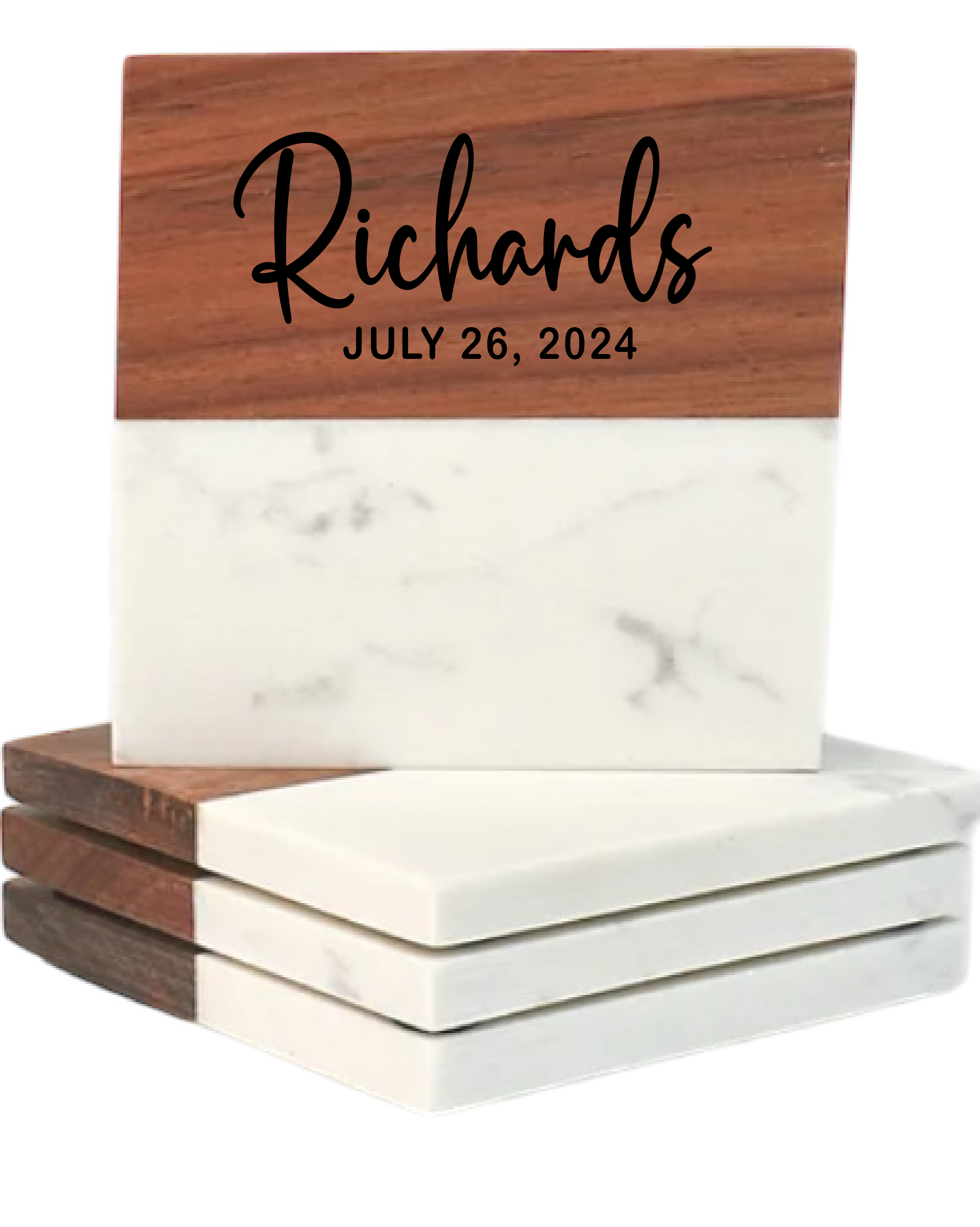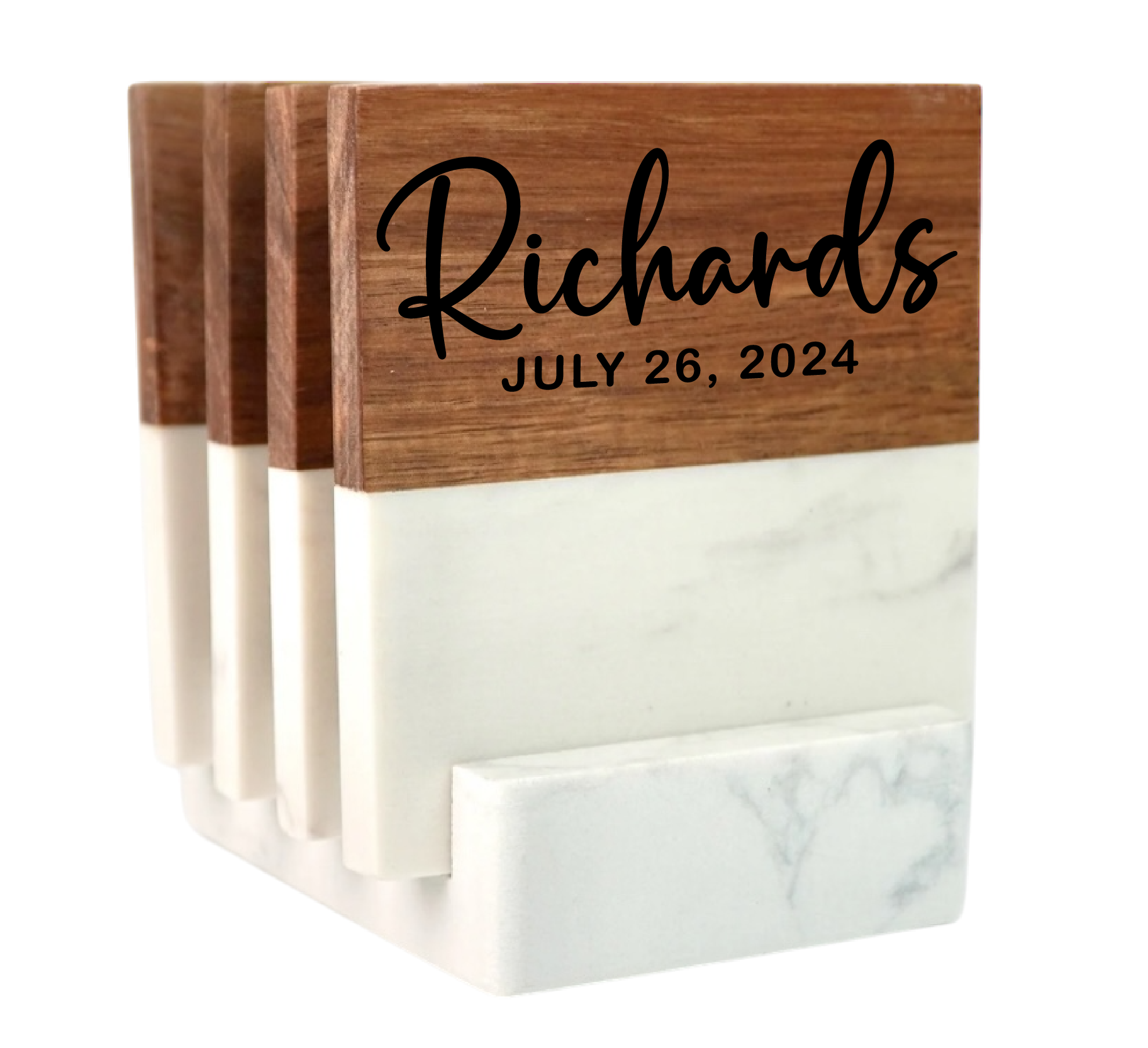 Each set includes four handcrafted coasters made from rich acacia wood and white marble, displayed in a coordinating marble base. Personalized with a last name or couple’s first names, along with a special date.