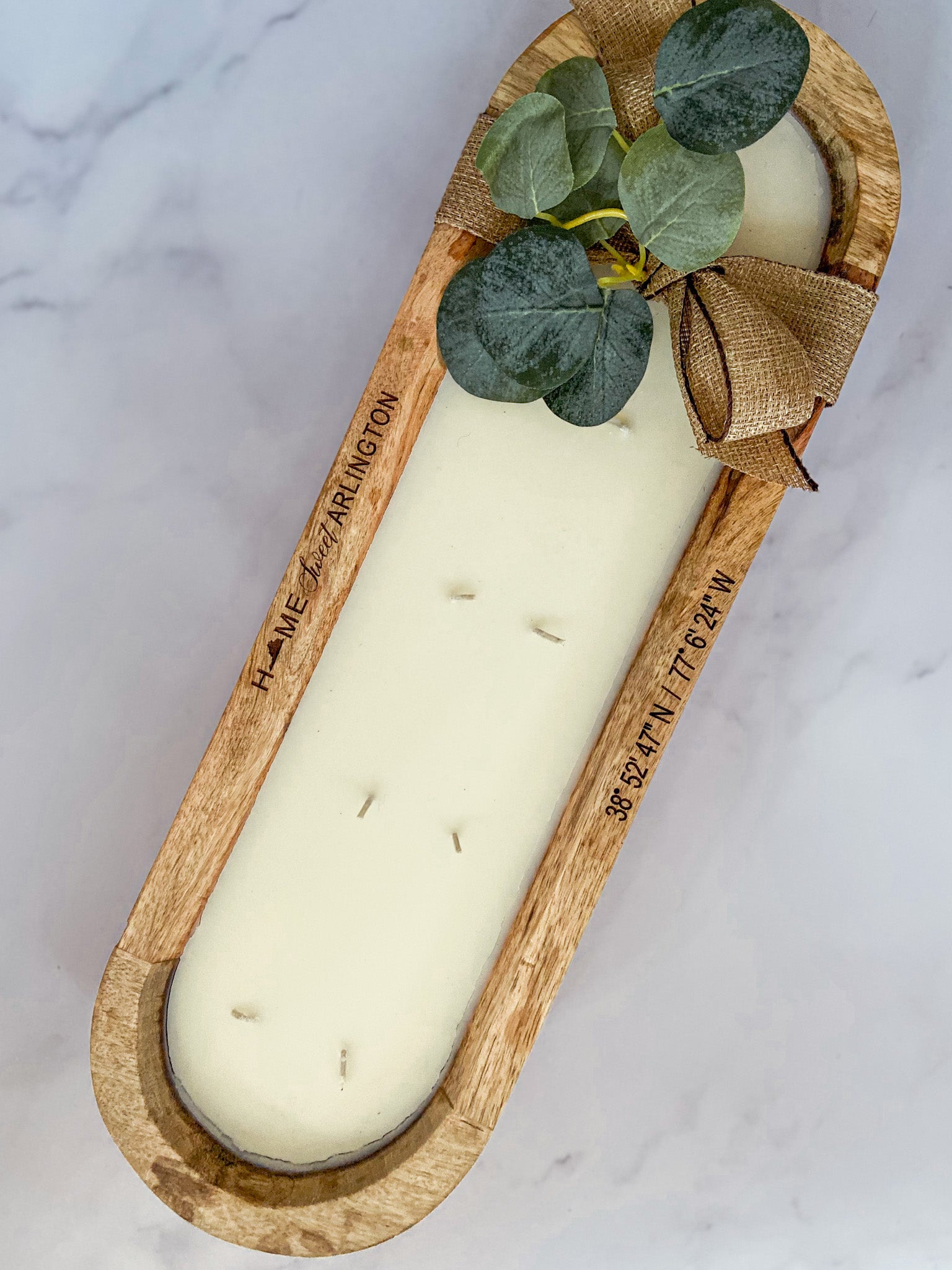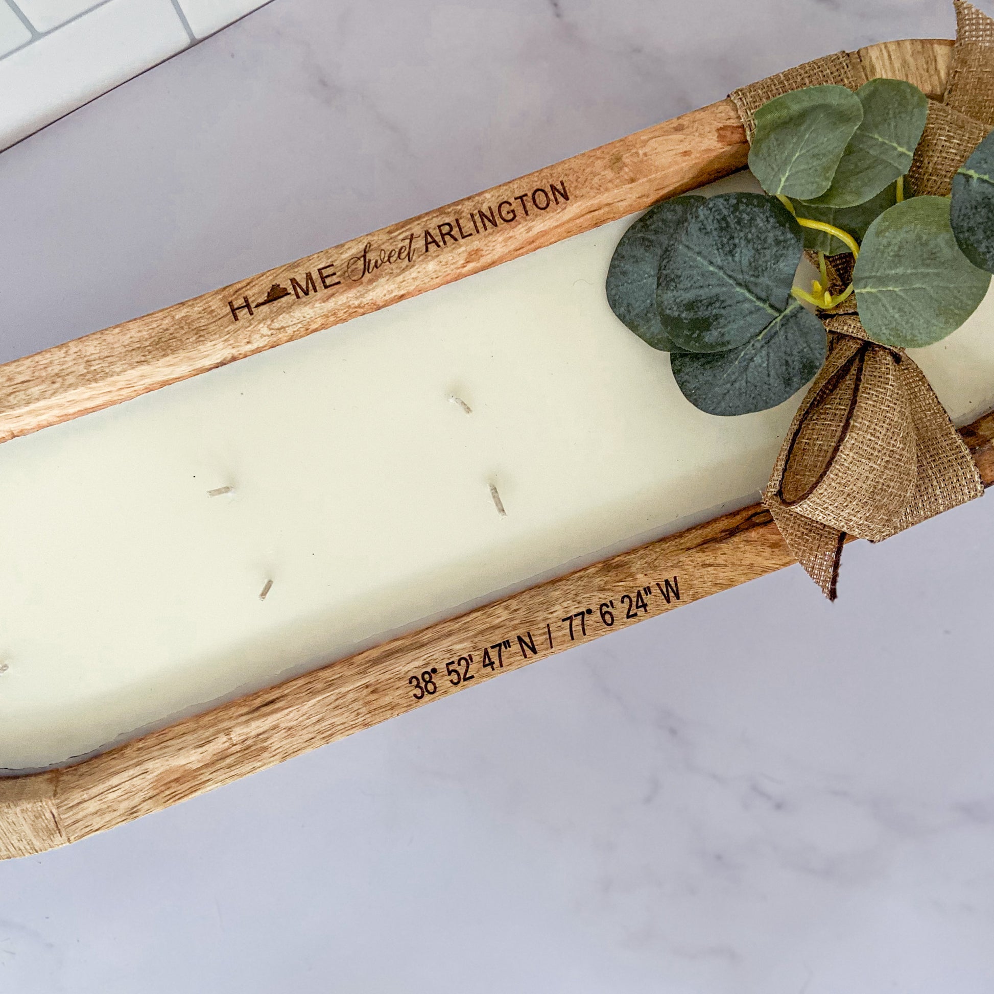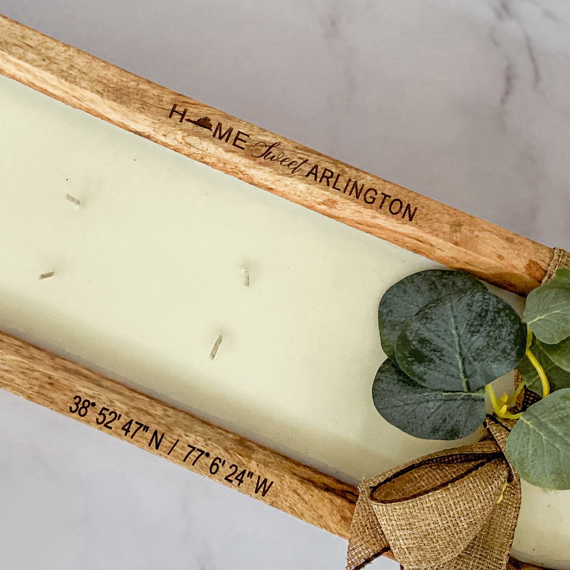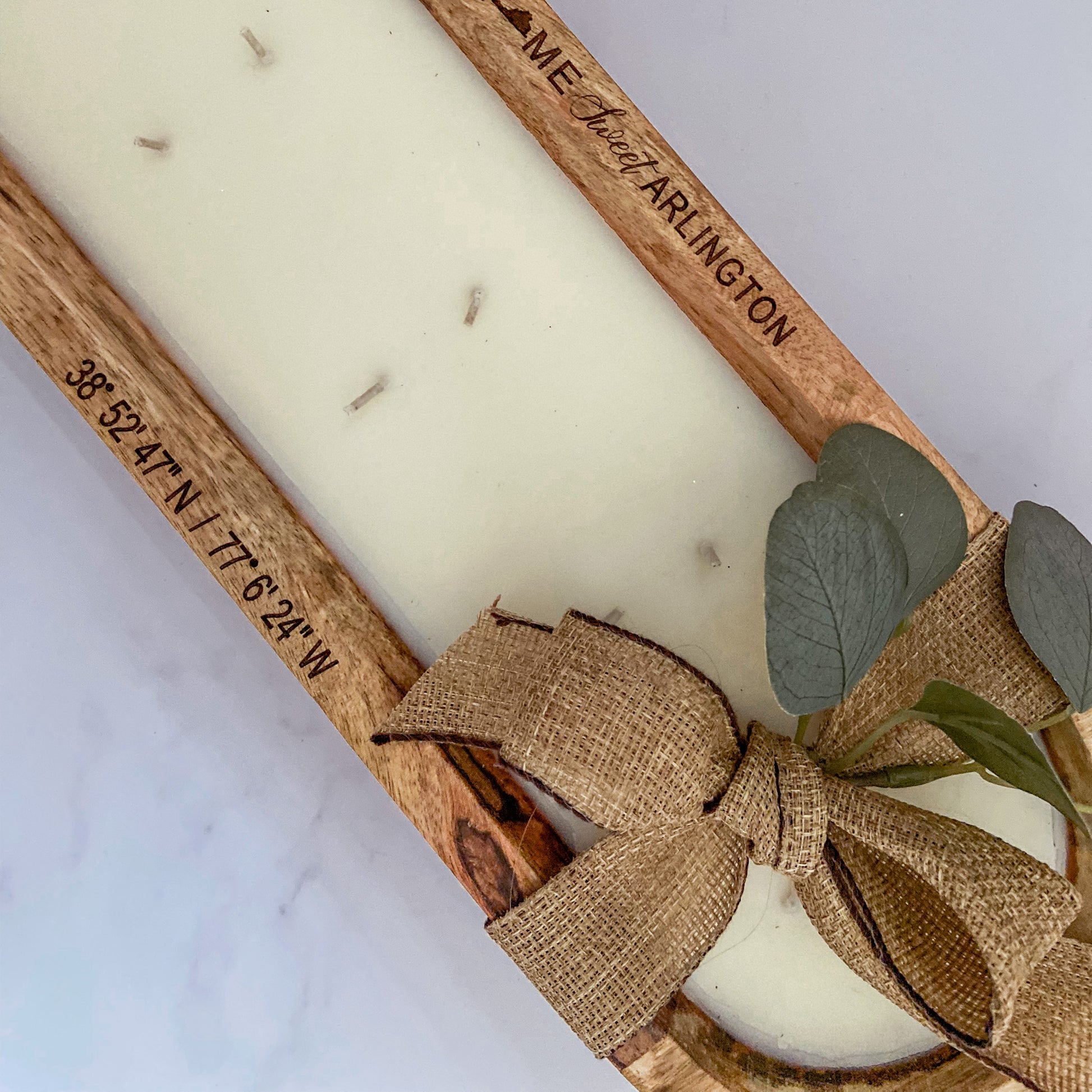 Beautiful soy blend, rustic candle engraved with Arlington coordinates is a lovely gift for a new couple or home. Subtle scent and 10 wicks will be a stand out accessory in any home. Customize with your own city. Enter city and state in the notes on the checkout page.