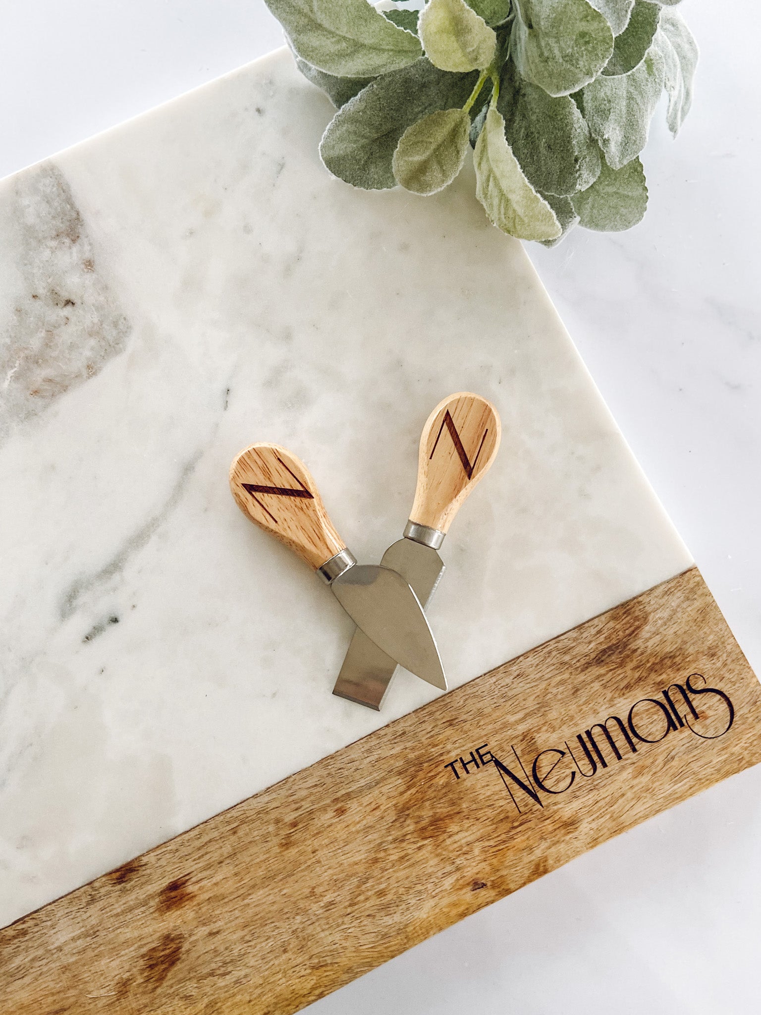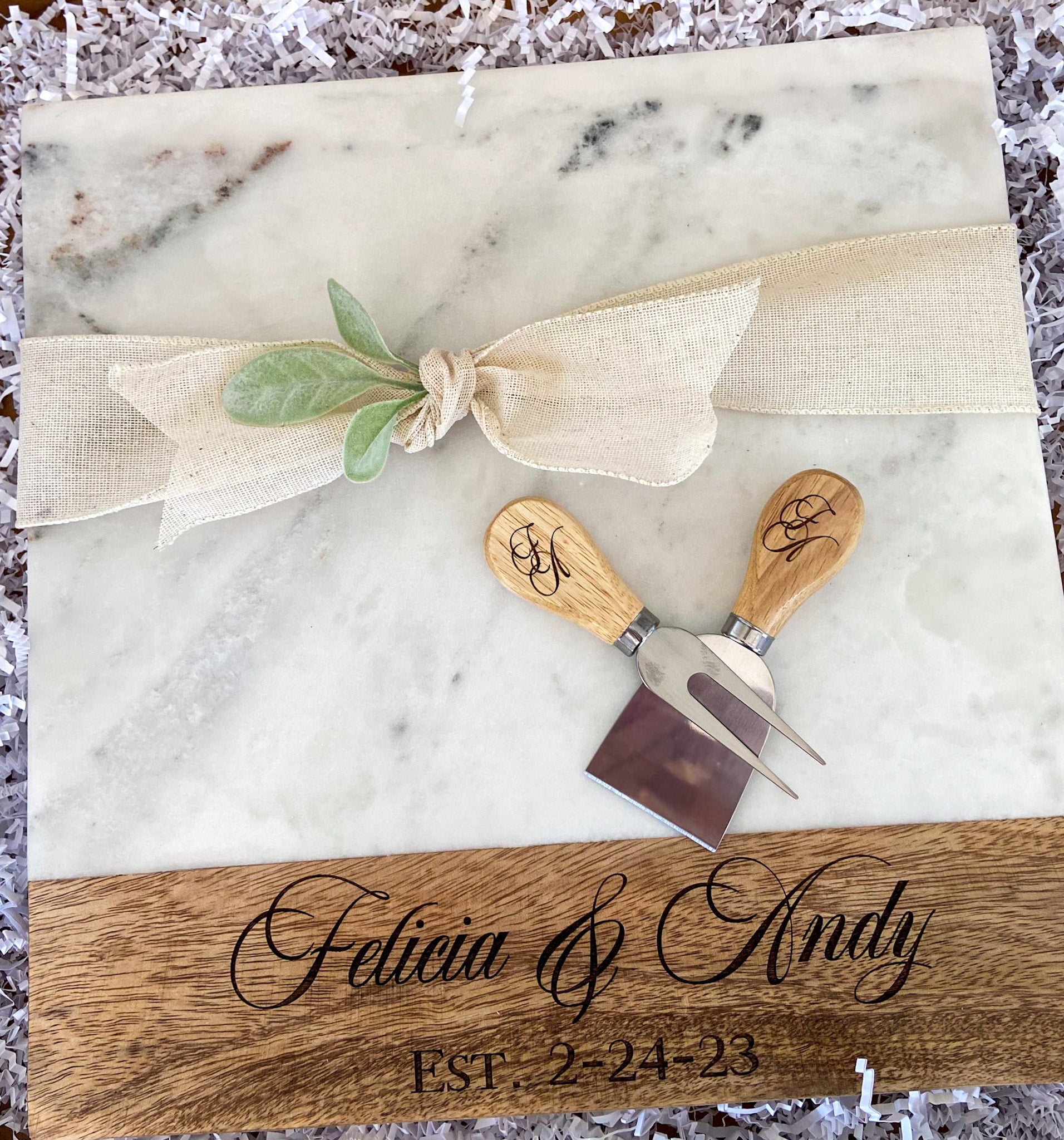 Beautiful wood and marble serving board. Choose from one of 10 designs to engrave on 13" square tray. If you have a preference for the placement of the engraving please enter in the notes section at checkout where specifically the engraving should be (center, left, right).